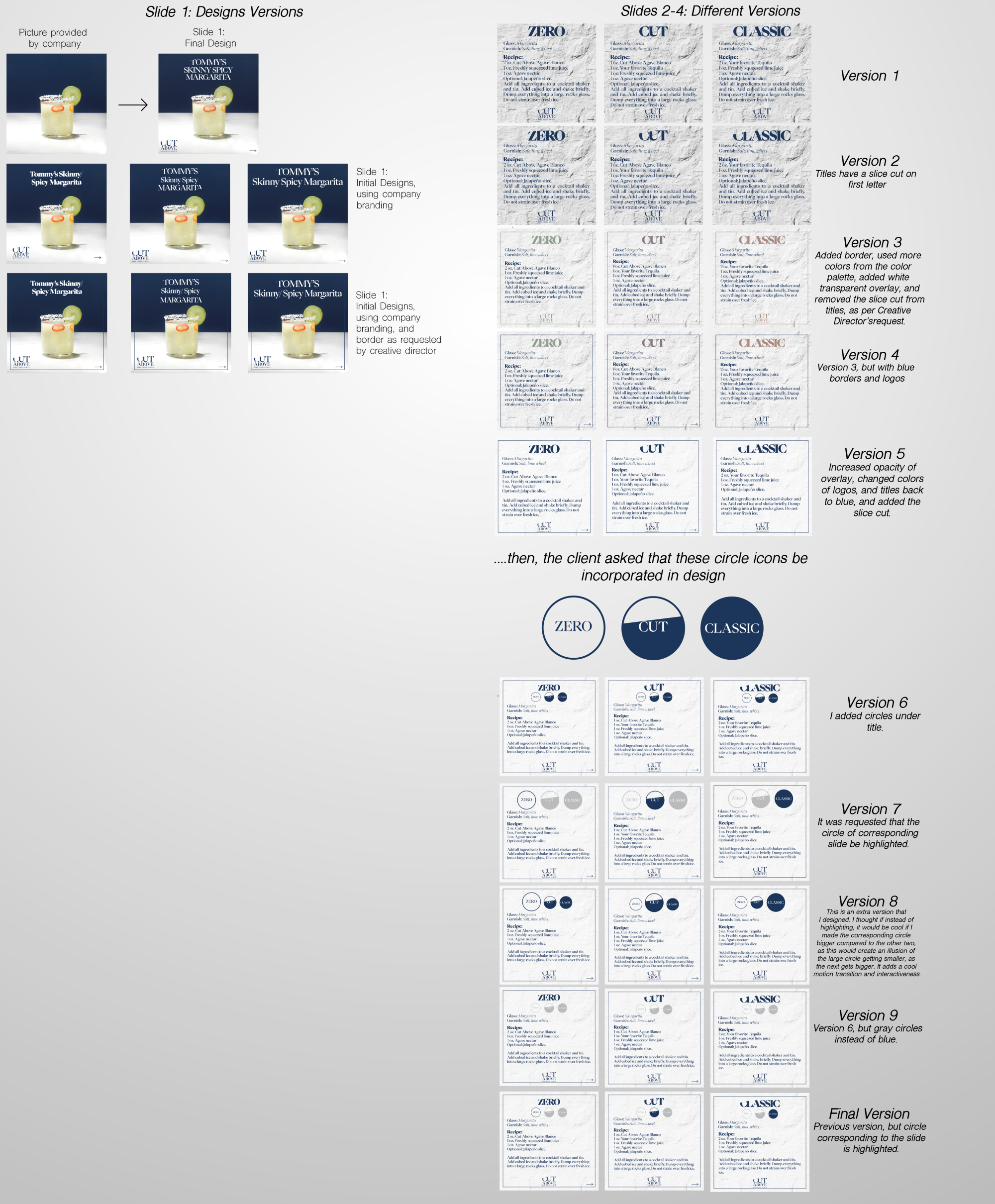 This post and was created simultaneously with the other "Drink Cut Above Recipe Posts" on my portfolio, with the purpose of settling on one consistent design or template for future recipe posts. That is one of the reasons as to why that are so many variations, but also because I always want to make sure that there is a selection to choose from. What I like is not what everyone else likes, and so I am always open to suggestions. Once settling on a specific format, the Creative Director asked me to provide a selection following the chosen format but with diverse color variations, which is why you may see repeating designs in different posts.